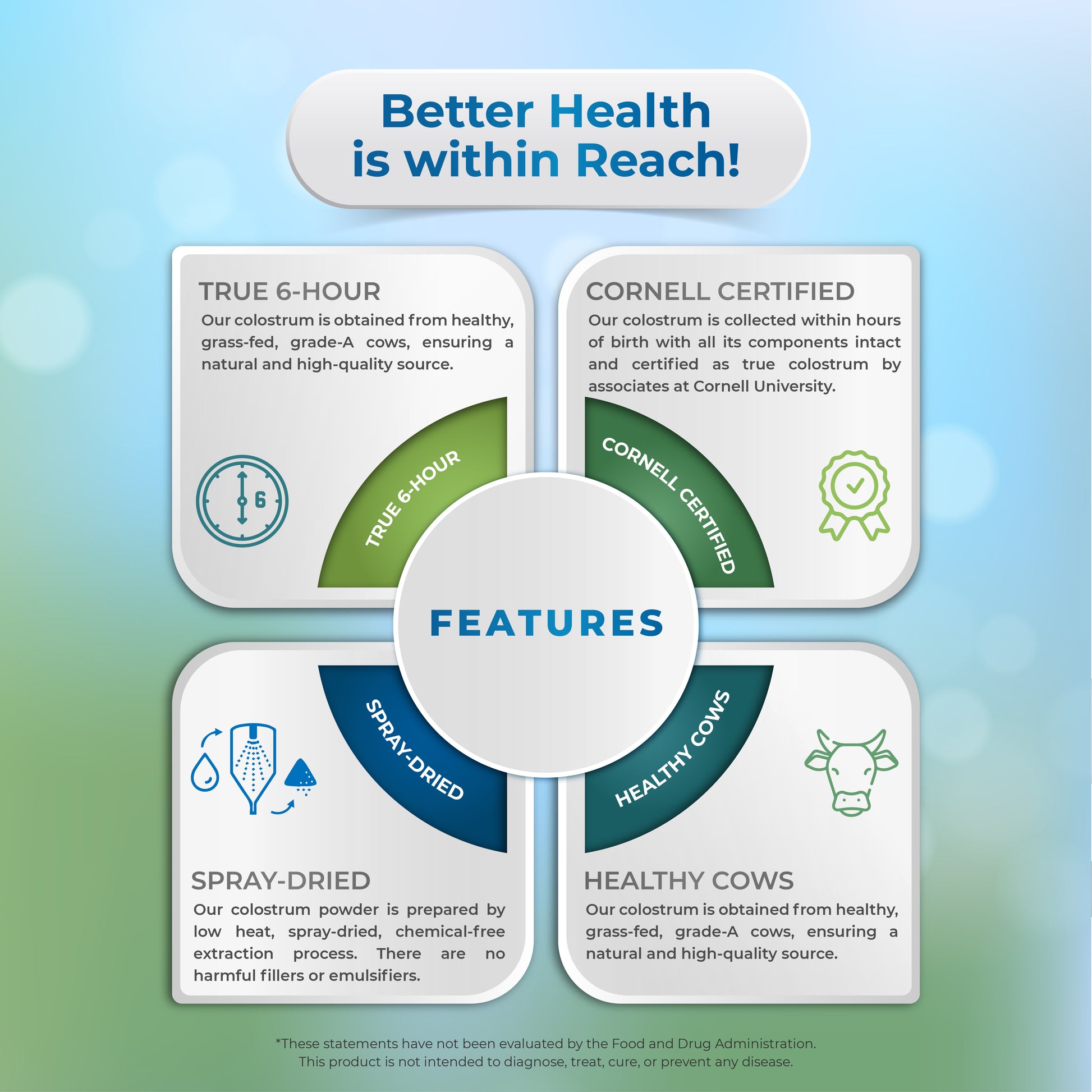 Choosing the right colostrum is very important because not all colostrum supplements are created equally. When choosing a colostrum supplement you should be certain it is only made from colostrum collected within hours of birth and that the colostrum is complete with none of its components having been removed, only our colostrum fulfills these demands as it’s the only colostrum supplement to be certified by associates of Cornell University as True colostrum. Our colostrum powder is low heat, spray dried, chemical free, and uses no fillers. Furthermore, the bovine colostrum that goes into making our colostrum is recovered from cows within 0 to 6 hours of them giving birth since it is a first milking colostrum, this means all of its nutrients are intact including natural chymosin which helps enter the gut. Help your body move and feel young again with the joint health supporting benefits of our colostrum.